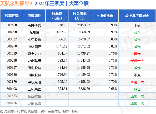 从基金规模来看,天弘永利债券B基金2024年三季度公布的基金规模为159.34亿元,较上一期规模175.57亿元变化了-16.23亿元,环比变化了-9.25%。该基金最新一期资产配置为:股票占净值比16.09%,债券占净值比101.17%,现金占净值比1.19%。从基金持仓来看,该基金当季前十大股票仓位达7.83%,第一大重仓股为申通快递(002468),持仓占比为0.99%。