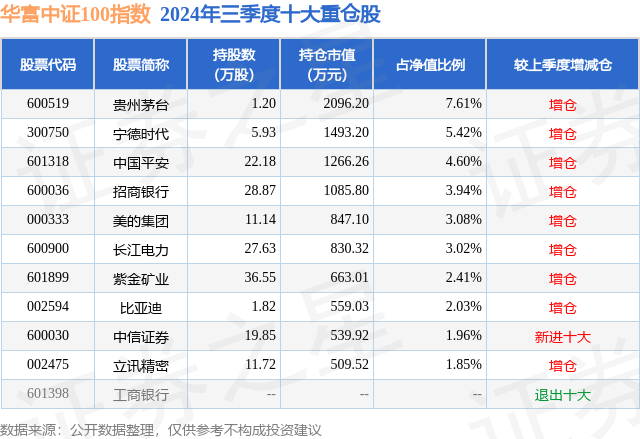 从基金规模来看,华富中证100指数基金2024年三季度公布的基金规模为2.75亿元,较上一期规模1.95亿元变化了8031.12万元,环比变化了41.18%。该基金最新一期资产配置为:股票占净值比90.2%,无债券类资产,现金占净值比11.36%。从基金持仓来看,该基金当季前十大股票仓位达35.92%,第一大重仓股为贵州茅台(600519),持仓占比为7.61%。