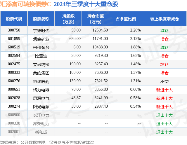 从基金规模来看,汇添富可转换债券C基金2024年三季度公布的基金规模为6.02亿元,较上一期规模5.25亿元变化了7741.63万元,环比变化了14.76%。该基金最新一期资产配置为:股票占净值比16.86%,债券占净值比82.86%,现金占净值比2.54%。从基金持仓来看,该基金当季前十大股票仓位达13.79%,第一大重仓股为宁德时代(300750),持仓占比为2.26%。