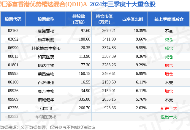 从基金规模来看,汇添富香港优势精选混合(QDII)A基金2024年三季度公布的基金规模为3.23亿元,较上一期规模2.92亿元变化了3110.22万元,环比变化了10.66%。该基金最新一期资产配置为:股票占净值比90.81%,无债券类资产,现金占净值比10.79%。从基金持仓来看,该基金当季前十大股票仓位达75.85%,第一大重仓股为康诺亚-B(02162),持仓占比为10.39%。