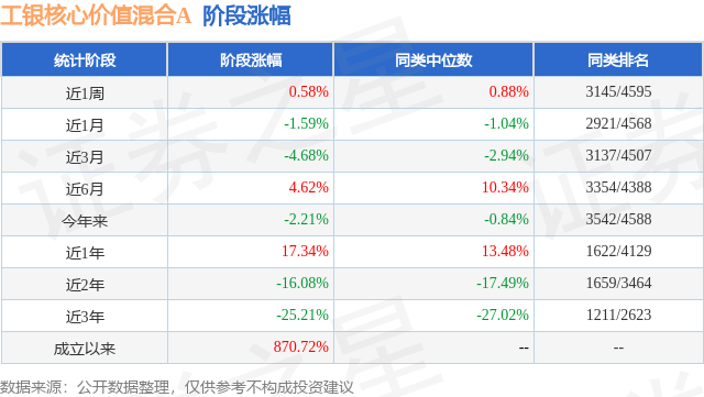 从业绩表现来看,工银核心价值混合A基金过去一年净值涨幅为7.63%,在同类基金中排名1538/3979,同类基金过去一年净值涨幅中位数为5.4%。而基金过去一年的最大回撤为-14.92%,成立以来的最大回撤为-52.68%。