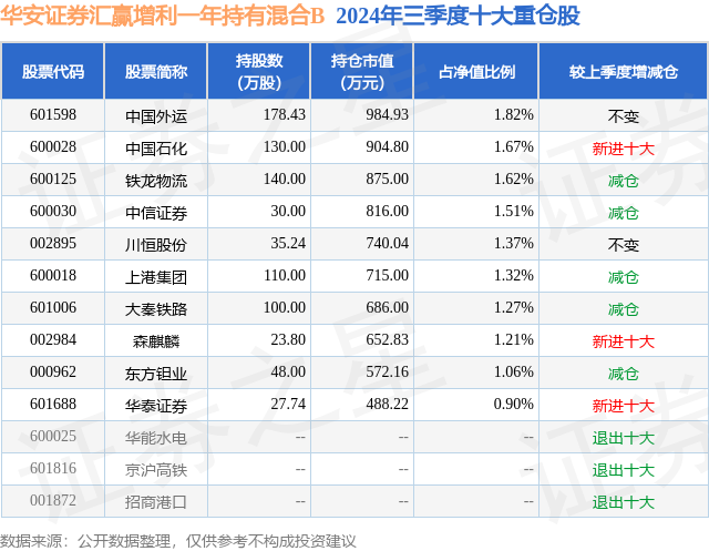 从基金规模来看,华安证券汇赢增利一年持有混合B基金2024年三季度公布的基金规模为3.08亿元,较上一期规模3.61亿元变化了-5263.9万元,环比变化了-14.58%。该基金最新一期资产配置为:股票占净值比29.74%,债券占净值比52.67%,现金占净值比10.16%。从基金持仓来看,该基金当季前十大股票仓位达13.75%,第一大重仓股为中国外运(601598),持仓占比为1.82%。