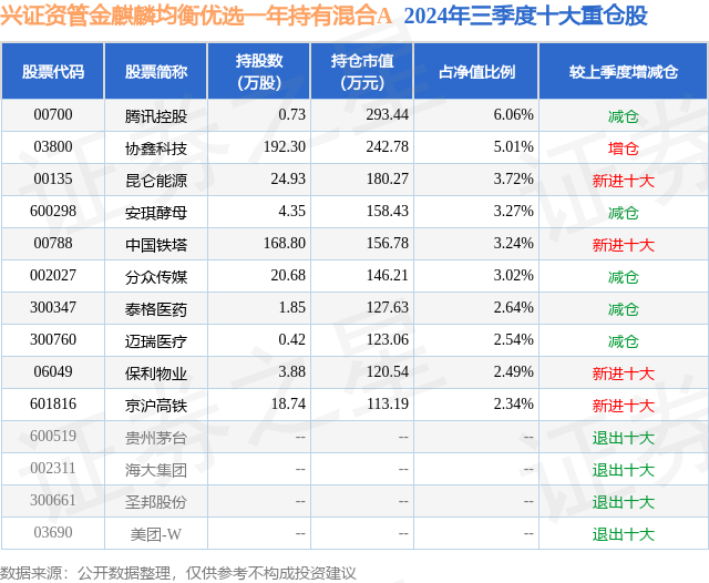 从基金规模来看,兴证资管金麒麟均衡优选一年持有混合A基金2024年三季度公布的基金规模为0.25亿元,较上一期规模2634.93万元变化了-89.19万元,环比变化了-3.39%。该基金最新一期资产配置为:股票占净值比73.03%,债券占净值比16.38%,现金占净值比6.4%。从基金持仓来看,该基金当季前十大股票仓位达34.33%,第一大重仓股为腾讯控股(00700),持仓占比为6.06%。