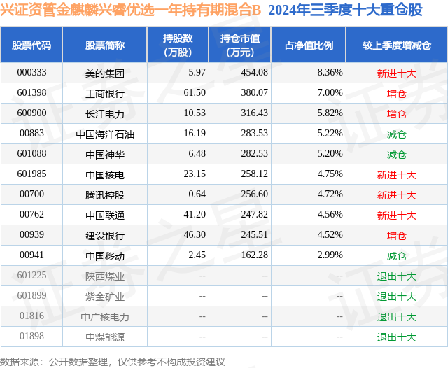 从基金规模来看,兴证资管金麒麟兴睿优选一年持有期混合B基金2024年三季度公布的基金规模为0.38亿元,较上一期规模3789.94万元变化了-14.37万元,环比变化了-0.38%。该基金最新一期资产配置为:股票占净值比83.18%,债券占净值比7.85%,现金占净值比25.13%。从基金持仓来看,该基金当季前十大股票仓位达53.14%,第一大重仓股为美的集团(000333),持仓占比为8.36%。