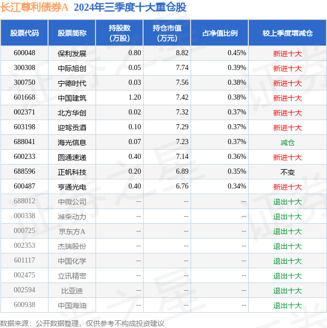 从基金规模来看,长江尊利债券A基金2024年三季度公布的基金规模为0.2亿元,较上一期规模2202.26万元变化了-241.31万元,环比变化了-10.96%。该基金最新一期资产配置为:股票占净值比16.41%,债券占净值比86.2%,现金占净值比1.85%。从基金持仓来看,该基金当季前十大股票仓位达3.76%,第一大重仓股为保利发展(600048),持仓占比为0.45%。