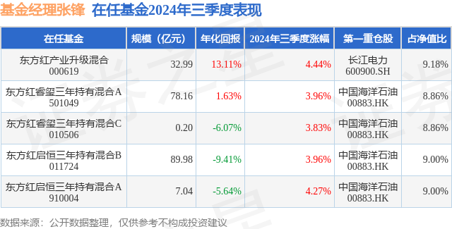 从基金规模来看,东方红启恒三年持有混合A基金2024年三季度公布的基金规模为7.04亿元,较上一期规模6.82亿元变化了2214.38万元,环比变化了3.25%。该基金最新一期资产配置为:股票占净值比72.89%,无债券类资产,现金占净值比24.84%。从基金持仓来看,该基金当季前十大股票仓位达59.69%,第一大重仓股为中国海洋石油(00883),持仓占比为9.0%。