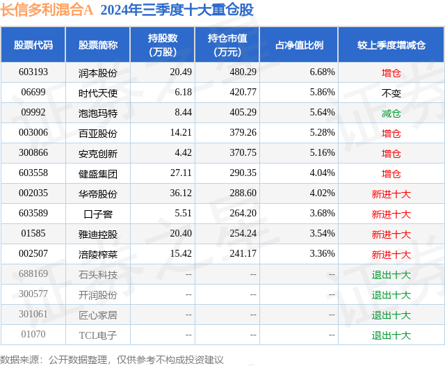 从基金规模来看,长信多利混合A基金2024年三季度公布的基金规模为0.71亿元,较上一期规模6480.51万元变化了663.91万元,环比变化了10.24%。该基金最新一期资产配置为:股票占净值比79.86%,债券占净值比4.19%,现金占净值比12.84%。从基金持仓来看,该基金当季前十大股票仓位达47.26%,第一大重仓股为润本股份(603193),持仓占比为6.68%。