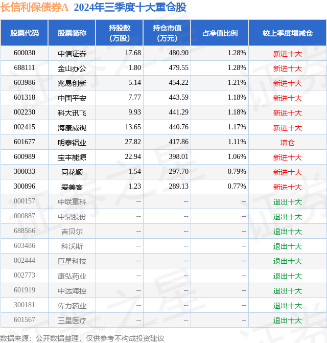从基金规模来看,长信利保债券A基金2024年三季度公布的基金规模为0.04亿元,较上一期规模343.37万元变化了57.91万元,环比变化了16.86%。该基金最新一期资产配置为:股票占净值比11.61%,债券占净值比88.37%,现金占净值比0.59%。从基金持仓来看,该基金当季前十大股票仓位达11.03%,第一大重仓股为中信证券(600030),持仓占比为1.28%。