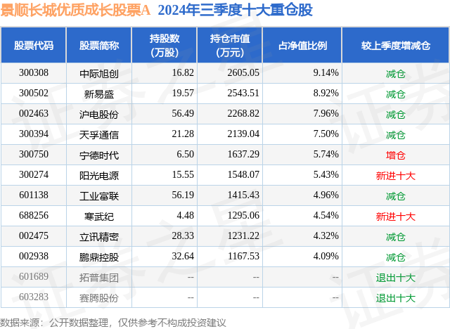 从基金规模来看,景顺长城优质成长股票A基金2024年三季度公布的基金规模为2.22亿元,较上一期规模2.61亿元变化了-3927.7万元,环比变化了-15.03%。该基金最新一期资产配置为:股票占净值比90.89%,无债券类资产,现金占净值比8.85%。从基金持仓来看,该基金当季前十大股票仓位达62.6%,第一大重仓股为中际旭创(300308),持仓占比为9.14%。