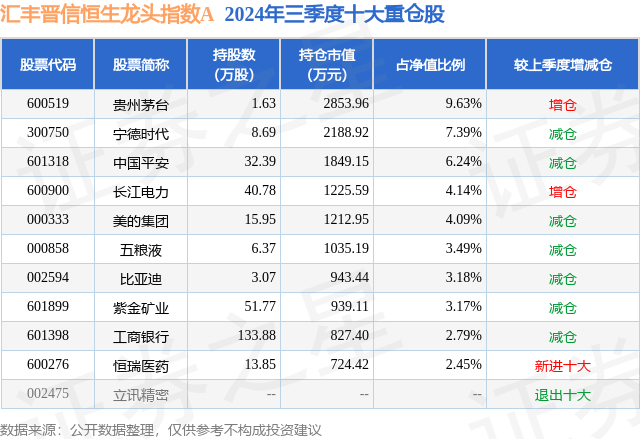 从基金规模来看,汇丰晋信恒生龙头指数A基金2024年三季度公布的基金规模为2.86亿元,较上一期规模2.43亿元变化了4291.28万元,环比变化了17.65%。该基金最新一期资产配置为:股票占净值比92.83%,无债券类资产,现金占净值比6.72%。从基金持仓来看,该基金当季前十大股票仓位达46.57%,第一大重仓股为贵州茅台(600519),持仓占比为9.63%。