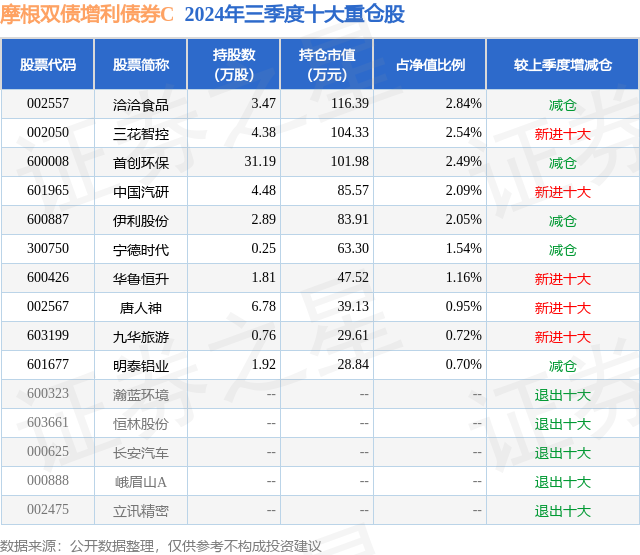 从基金规模来看,摩根双债增利债券C基金2024年三季度公布的基金规模为0.04亿元,较上一期规模428.45万元变化了6.0万元,环比变化了1.4%。该基金最新一期资产配置为:股票占净值比22.32%,债券占净值比90.2%,现金占净值比3.55%。从基金持仓来看,该基金当季前十大股票仓位达17.08%,第一大重仓股为洽洽食品(002557),持仓占比为2.84%。