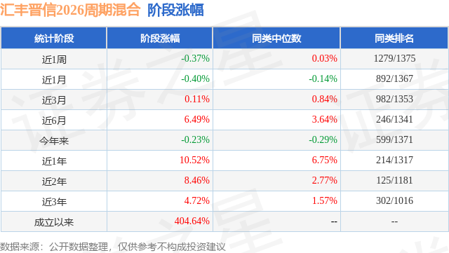 从业绩表现来看,汇丰晋信2026周期混合基金过去一年净值涨幅为9.39%,在同类基金中排名116/1322,同类基金过去一年净值涨幅中位数为4.43%。而基金过去一年的最大回撤为-5.95%,成立以来的最大回撤为-51.66%。