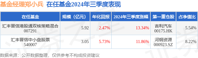汇丰晋信中小盘股票现任基金经理为郑小兵。其中在任基金经理郑小兵已从业1年又112天,2023年7月8日正式接手管理汇丰晋信中小盘股票,任职期间累计回报为17.23%。目前还管理着2只基金产品(包括A类和C类),其中本季度表现最佳的基金为汇丰晋信港股通双核策略混合(007291),季度净值涨幅为13.34%。