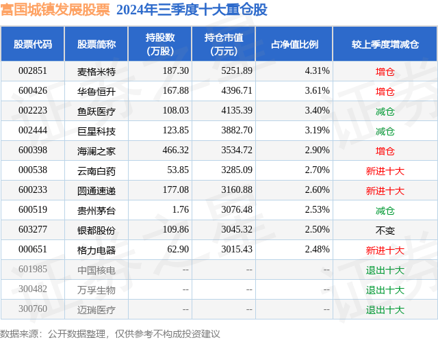 从基金规模来看,富国城镇发展股票基金2024年三季度公布的基金规模为12.18亿元,较上一期规模11.75亿元变化了4271.95万元,环比变化了3.64%。该基金最新一期资产配置为:股票占净值比87.89%,债券占净值比2.01%,现金占净值比11.67%。从基金持仓来看,该基金当季前十大股票仓位达30.22%,第一大重仓股为麦格米特(002851),持仓占比为4.31%。