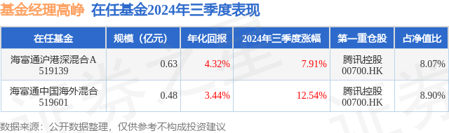 从基金规模来看,海富通中国海外混合基金2024年三季度公布的基金规模为0.48亿元,较上一期规模4274.02万元变化了503.94万元,环比变化了11.79%。该基金最新一期资产配置为:股票占净值比91.41%,无债券类资产,现金占净值比7.09%。从基金持仓来看,该基金当季前十大股票仓位达50.85%,第一大重仓股为腾讯控股(00700),持仓占比为8.9%。