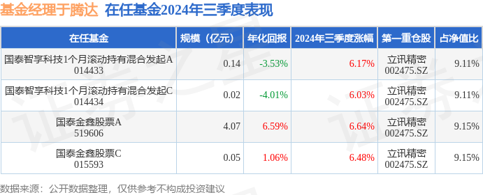 从基金规模来看,国泰金鑫股票A基金2024年三季度公布的基金规模为4.07亿元,较上一期规模3.96亿元变化了1169.33万元,环比变化了2.96%。该基金最新一期资产配置为:股票占净值比94.44%,债券占净值比4.99%,现金占净值比1.24%。从基金持仓来看,该基金当季前十大股票仓位达53.3%,第一大重仓股为立讯精密(002475),持仓占比为9.15%。