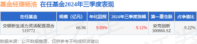 证券之星消息,日前交银新生活力灵活配置混合基金公布三季报,2024年三季度最新规模66.96亿元,季度净值涨幅为9.12%。