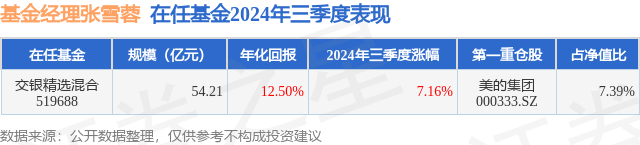 证券之星消息,日前交银精选混合基金公布三季报,2024年三季度最新规模54.21亿元,季度净值涨幅为7.16%。