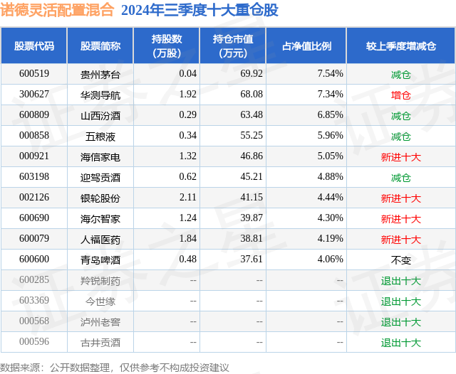 从基金规模来看,诺德灵活配置混合基金2024年三季度公布的基金规模为0.09亿元,较上一期规模867.85万元变化了59.32万元,环比变化了6.84%。该基金最新一期资产配置为:股票占净值比77.24%,债券占净值比14.58%,现金占净值比10.07%。从基金持仓来看,该基金当季前十大股票仓位达54.61%,第一大重仓股为贵州茅台(600519),持仓占比为7.54%。