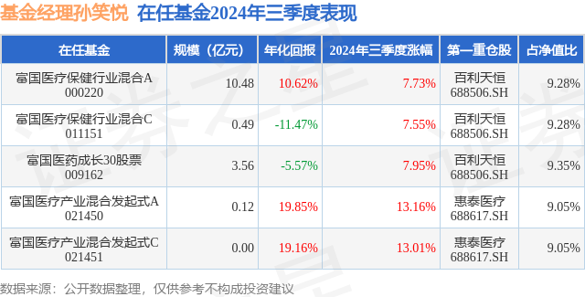 富国医疗保健行业混合A现任基金经理为孙笑悦。其中在任基金经理孙笑悦已从业4年又202天,2020年4月13日正式接手管理富国医疗保健行业混合A,任职期间累计回报为-7.56%。目前还管理着5只基金产品(包括A类和C类),其中本季度表现最佳的基金为富国医疗产业混合发起式A(021450),季度净值涨幅为13.16%。