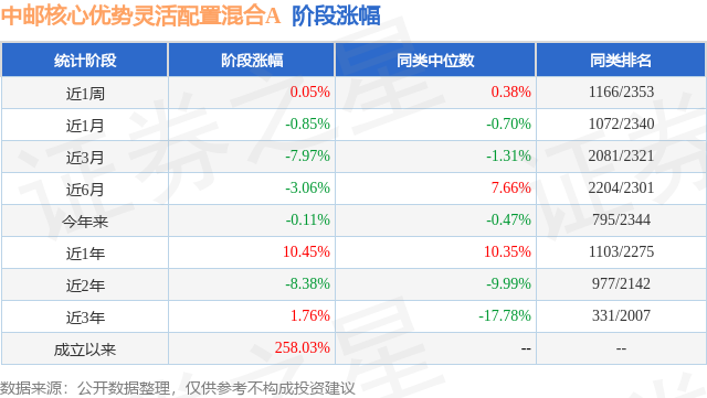 从业绩表现来看,中邮核心优势灵活配置混合A基金过去一年净值涨幅为13.63%,在同类基金中排名357/2261,同类基金过去一年净值涨幅中位数为5.1%。而基金过去一年的最大回撤为-19.62%,成立以来的最大回撤为-61.22%。
