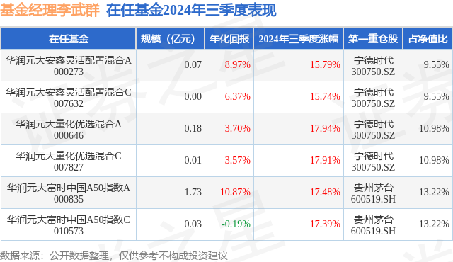 从基金规模来看,华润元大安鑫灵活配置混合A基金2024年三季度公布的基金规模为0.07亿元,较上一期规模579.33万元变化了94.37万元,环比变化了16.29%。该基金最新一期资产配置为:股票占净值比87.46%,债券占净值比2.96%,现金占净值比7.39%。从基金持仓来看,该基金当季前十大股票仓位达44.62%,第一大重仓股为宁德时代(300750),持仓占比为9.55%。