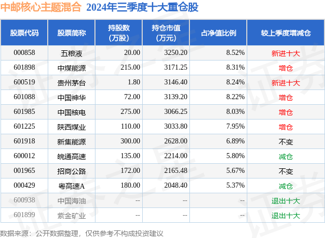从基金规模来看,中邮核心主题混合基金2024年三季度公布的基金规模为3.82亿元,较上一期规模3.76亿元变化了551.27万元,环比变化了1.47%。该基金最新一期资产配置为:股票占净值比94.21%,无债券类资产,现金占净值比13.14%。从基金持仓来看,该基金当季前十大股票仓位达73.0%,第一大重仓股为五粮液(000858),持仓占比为8.52%。