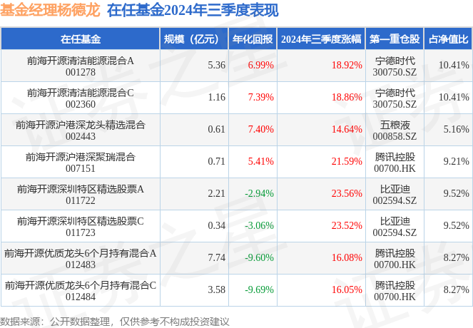前海开源清洁能源混合A现任基金经理为杨德龙。其中在任基金经理杨德龙已从业10年又320天,2021年3月18日正式接手管理前海开源清洁能源混合A,任职期间累计回报为-14.77%。目前还管理着8只基金产品(包括A类和C类),其中本季度表现最佳的基金为前海开源深圳特区精选股票A(011722),季度净值涨幅为23.56%。