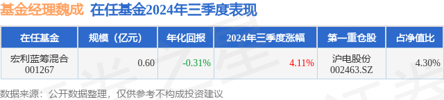 从基金规模来看,宏利蓝筹混合基金2024年三季度公布的基金规模为0.6亿元,较上一期规模5169.47万元变化了827.05万元,环比变化了16.0%。该基金最新一期资产配置为:股票占净值比85.32%,无债券类资产,现金占净值比29.88%。从基金持仓来看,该基金当季前十大股票仓位达35.13%,第一大重仓股为沪电股份(002463),持仓占比为4.3%。