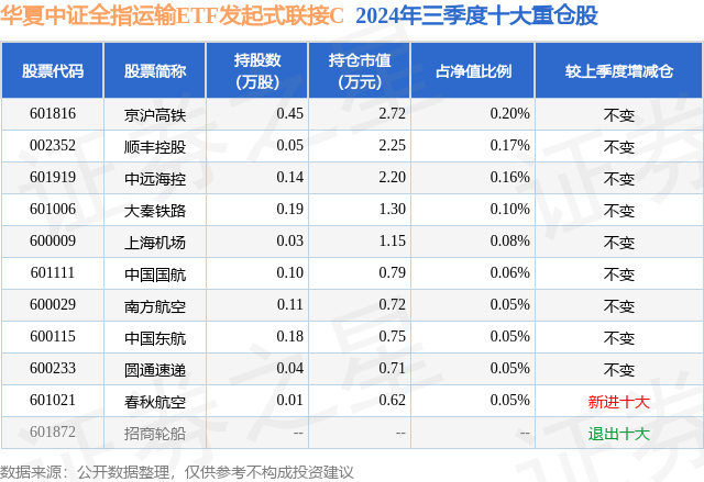 从基金规模来看,华夏中证全指运输ETF发起式联接C基金2024年三季度公布的基金规模为0.01亿元,较上一期规模170.7万元变化了-26.03万元,环比变化了-15.25%。该基金最新一期资产配置为:股票占净值比1.77%,无债券类资产,现金占净值比5.96%。从基金持仓来看,该基金当季前十大股票仓位达0.97%,第一大重仓股为京沪高铁(601816),持仓占比为0.2%。