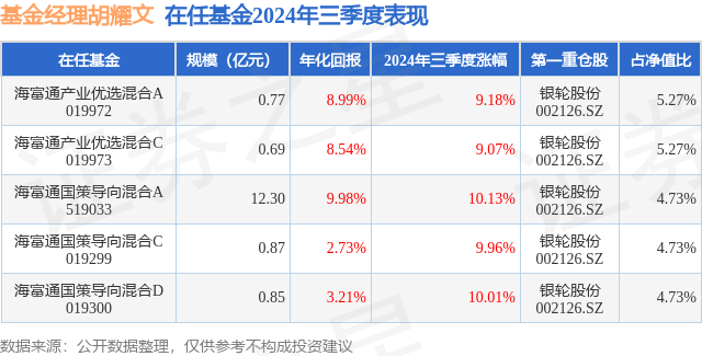 海富通国策导向混合C现任基金经理为胡耀文。其中在任基金经理胡耀文已从业9年又26天,2023年9月1日正式接手管理海富通国策导向混合C,任职期间累计回报为3.15%。目前还管理着5只基金产品(包括A类和C类),其中本季度表现最佳的基金为海富通国策导向混合A(519033),季度净值涨幅为10.13%。