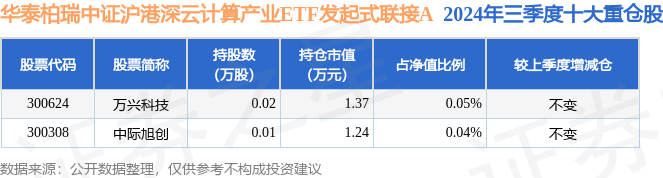 从基金规模来看,华泰柏瑞中证沪港深云计算产业ETF发起式联接A基金2024年三季度公布的基金规模为0.29亿元,较上一期规模2420.6万元变化了492.84万元,环比变化了20.36%。该基金最新一期资产配置为:股票占净值比0.09%,债券占净值比0.34%,现金占净值比5.11%。从基金持仓来看,该基金当季前十大股票仓位达0.09%,第一大重仓股为万兴科技(300624),持仓占比为0.05%。