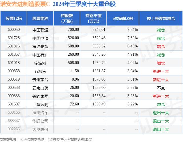 从基金规模来看,诺安先进制造股票C基金2024年三季度公布的基金规模为0.87亿元,较上一期规模9523.9万元变化了-839.24万元,环比变化了-8.81%。该基金最新一期资产配置为:股票占净值比85.54%,无债券类资产,现金占净值比17.54%。从基金持仓来看,该基金当季前十大股票仓位达47.93%,第一大重仓股为中国联通(600050),持仓占比为7.84%。