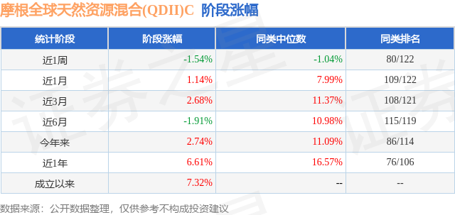 从业绩表现来看,摩根全球天然资源混合(QDII)C基金过去一年净值涨幅为6.61%,在同类基金中排名76/106,同类基金过去一年净值涨幅中位数为16.57%。而基金过去一年的最大回撤为-11.37%,成立以来的最大回撤为-11.37%。