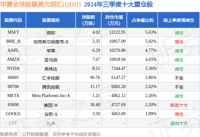 从基金规模来看,华夏全球股票美元现汇(QDII)基金2024年三季度公布的基金规模为21.53亿元,较上一期规模21.91亿元变化了-3828.85万元,环比变化了-1.75%。该基金最新一期资产配置为:股票占净值比81.36%,无债券类资产,现金占净值比9.12%。从基金持仓来看,该基金当季前十大股票仓位达35.46%,第一大重仓股为微软(MSFT),持仓占比为5.63%。