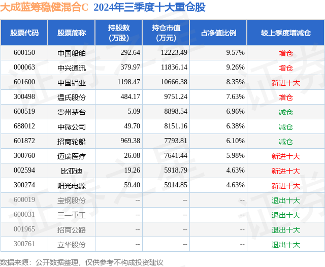 从基金规模来看,大成蓝筹稳健混合C基金2024年三季度公布的基金规模为0.07亿元,较上一期规模571.94万元变化了101.77万元,环比变化了17.79%。该基金最新一期资产配置为:股票占净值比92.13%,无债券类资产,现金占净值比7.97%。从基金持仓来看,该基金当季前十大股票仓位达69.49%,第一大重仓股为中国船舶(600150),持仓占比为9.57%。