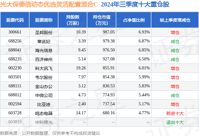 从基金规模来看,光大保德信动态优选灵活配置混合C基金2024年三季度公布的基金规模为0.0亿元,较上一期规模0.86万元变化了1.06万元,环比变化了123.51%。该基金最新一期资产配置为:股票占净值比79.69%,债券占净值比15.82%,现金占净值比4.59%。从基金持仓来看,该基金当季前十大股票仓位达60.36%,第一大重仓股为圣邦股份(300661),持仓占比为6.93%。