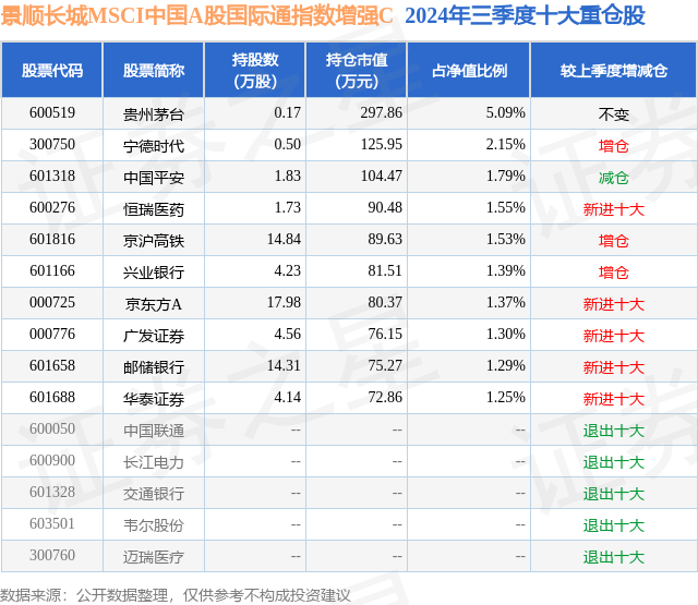 从基金规模来看,景顺长城MSCI中国A股国际通指数增强C基金2024年三季度公布的基金规模为0.11亿元,较上一期规模603.55万元变化了526.28万元,环比变化了87.2%。该基金最新一期资产配置为:股票占净值比91.2%,无债券类资产,现金占净值比8.66%。从基金持仓来看,该基金当季前十大股票仓位达18.71%,第一大重仓股为贵州茅台(600519),持仓占比为5.09%。