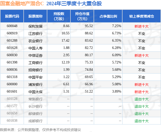 从基金规模来看,国富金融地产混合C基金2024年三季度公布的基金规模为0.05亿元,较上一期规模458.04万元变化了48.04万元,环比变化了10.49%。该基金最新一期资产配置为:股票占净值比86.52%,无债券类资产,现金占净值比13.53%。从基金持仓来看,该基金当季前十大股票仓位达58.36%,第一大重仓股为保利发展(600048),持仓占比为7.25%。