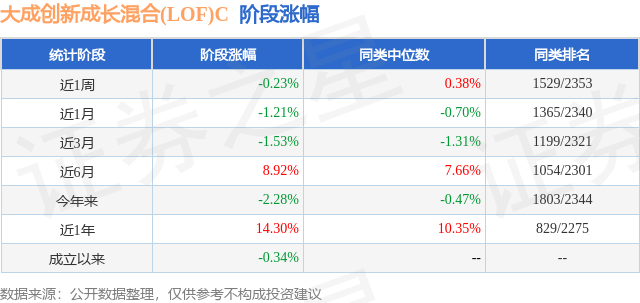从业绩表现来看,大成创新成长混合(LOF)C基金过去一年净值涨幅为5.53%,在同类基金中排名1048/2261,同类基金过去一年净值涨幅中位数为5.1%。而基金过去一年的最大回撤为-17.35%,成立以来的最大回撤为-18.71%。