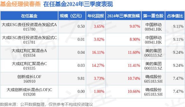大成创新成长混合(LOF)C现任基金经理为侯春燕。其中在任基金经理侯春燕已从业8年又325天,2023年9月19日正式接手管理大成创新成长混合(LOF)C,任职期间累计回报为1.1%。目前还管理着6只基金产品(包括A类和C类),其中本季度表现最佳的基金为大成红利汇聚混合A(019334),季度净值涨幅为11.6%。