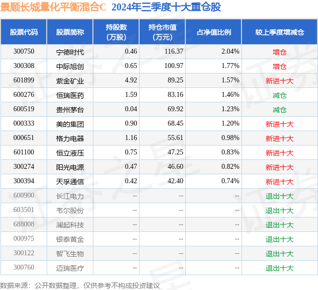 从基金规模来看,景顺长城量化平衡混合C基金2024年三季度公布的基金规模为0.0亿元,较上一期规模2.05万元变化了0.22万元,环比变化了10.47%。该基金最新一期资产配置为:股票占净值比92.98%,无债券类资产,现金占净值比7.85%。从基金持仓来看,该基金当季前十大股票仓位达12.64%,第一大重仓股为宁德时代(300750),持仓占比为2.04%。