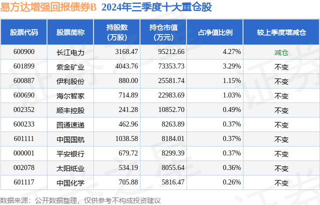 从基金规模来看,易方达增强回报债券B基金2024年三季度公布的基金规模为48.98亿元,较上一期规模59.32亿元变化了-10.33亿元,环比变化了-17.42%。该基金最新一期资产配置为:股票占净值比15.72%,债券占净值比81.0%,现金占净值比0.03%。从基金持仓来看,该基金当季前十大股票仓位达11.96%,第一大重仓股为长江电力(600900),持仓占比为4.27%。