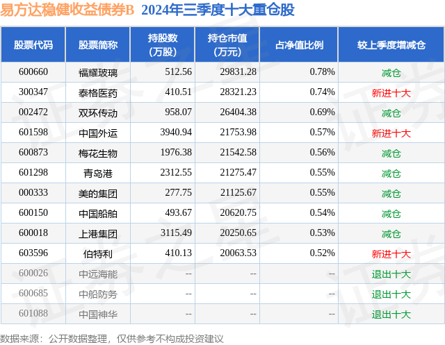 从基金规模来看,易方达稳健收益债券B基金2024年三季度公布的基金规模为296.38亿元,较上一期规模347.33亿元变化了-50.95亿元,环比变化了-14.67%。该基金最新一期资产配置为:股票占净值比15.93%,债券占净值比87.49%,现金占净值比0.13%。从基金持仓来看,该基金当季前十大股票仓位达6.03%,第一大重仓股为福耀玻璃(600660),持仓占比为0.78%。