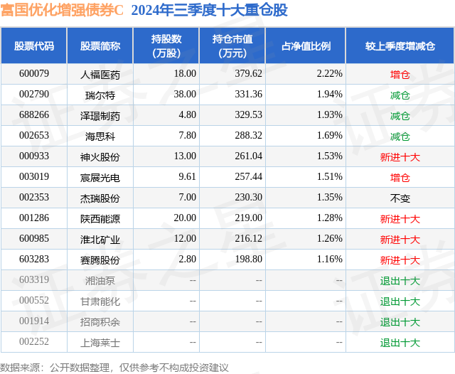 从基金规模来看,富国优化增强债券C基金2024年三季度公布的基金规模为0.58亿元,较上一期规模6742.03万元变化了-953.97万元,环比变化了-14.15%。该基金最新一期资产配置为:股票占净值比21.63%,债券占净值比109.69%,现金占净值比2.23%。从基金持仓来看,该基金当季前十大股票仓位达15.87%,第一大重仓股为人福医药(600079),持仓占比为2.22%。