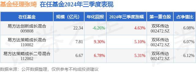 从基金规模来看,易方达策略成长混合基金2024年三季度公布的基金规模为7.81亿元,较上一期规模7.52亿元变化了2849.02万元,环比变化了3.79%。该基金最新一期资产配置为:股票占净值比91.0%,无债券类资产,现金占净值比9.55%。从基金持仓来看,该基金当季前十大股票仓位达46.99%,第一大重仓股为双环传动(002472),持仓占比为6.07%。