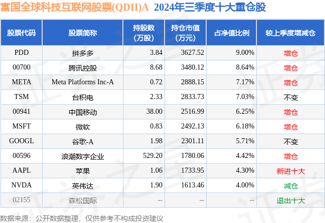 从基金规模来看,富国全球科技互联网股票(QDII)A基金2024年三季度公布的基金规模为4.03亿元,较上一期规模3.73亿元变化了2974.99万元,环比变化了7.97%。该基金最新一期资产配置为:股票占净值比64.13%,无债券类资产,现金占净值比15.26%。从基金持仓来看,该基金当季前十大股票仓位达62.7%,第一大重仓股为拼多多(PDD),持仓占比为9.0%。