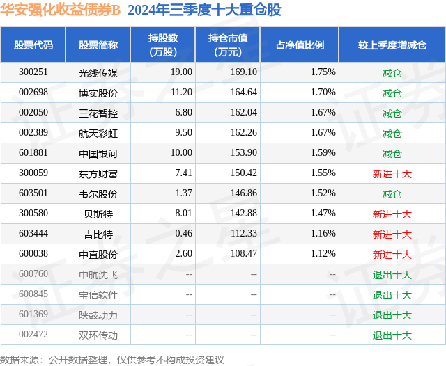 从基金规模来看,华安强化收益债券B基金2024年三季度公布的基金规模为0.23亿元,较上一期规模3068.41万元变化了-806.1万元,环比变化了-26.27%。该基金最新一期资产配置为:股票占净值比19.22%,债券占净值比81.33%,现金占净值比0.7%。从基金持仓来看,该基金当季前十大股票仓位达15.2%,第一大重仓股为光线传媒(300251),持仓占比为1.75%。