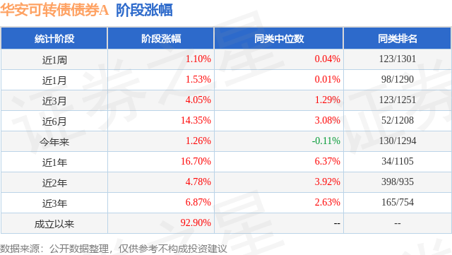 从业绩表现来看,华安可转债债券A基金过去一年净值涨幅为6.42%,在同类基金中排名254/1063,同类基金过去一年净值涨幅中位数为4.0%。而基金过去一年的最大回撤为-12.27%,成立以来的最大回撤为-59.12%。
