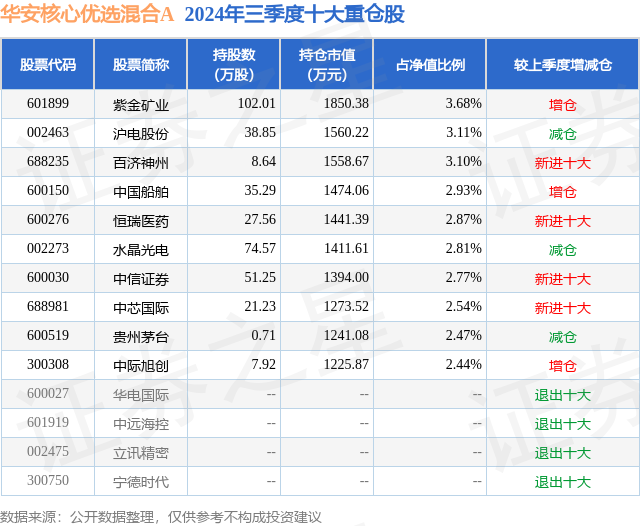 从基金规模来看,华安核心优选混合A基金2024年三季度公布的基金规模为5.01亿元,较上一期规模4.61亿元变化了3981.53万元,环比变化了8.63%。该基金最新一期资产配置为:股票占净值比93.2%,无债券类资产,现金占净值比5.89%。从基金持仓来看,该基金当季前十大股票仓位达28.72%,第一大重仓股为紫金矿业(601899),持仓占比为3.68%。